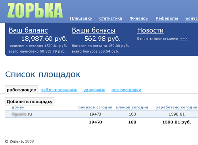 Приглашаем вебмастеров максимально просто увеличить доходы с ваших сайтов и получать стабильные выплаты в удобных валютах. Приглашаем! - сайты с посещаемостью от 2-х человек в сутки - сайты любых тематик, кроме «вареза» и «порно» - индивидуальные условия для сайтов с посещаемостью от 3000 чел. в день. Мы предлагаем: - минимальный баланс для выплаты – 100р. - высокая стоимость кликов (у нас нет курса ЦБ, по этому выгода на 20% больше) - стабильные выплаты без задержек (2 раза в месяц) - круглосуточная служба поддержки - работа в системе либо с у.е., либо с рублями, как вам удобнее - выплаты в Яндекс.Деньгах, WMZ, WMR, ePass - большая бонусная программа. Вы получаете дополнительно 5% к заработку в виде бонусов, которые можно тратить на любые привычные вам сервисы (оплата хостинга, регистрация доменов, покупка ссылок, CMS, контента, регистрация в каталогах) - реферальская программа с большим количеством рекламных материалов (более 100 баннеров на любой вкус) - удобная и понятная статистика - бесплатные консультации по настройке объявлений С чего начать: 1. Зарегистрироваться и добавить сайт (или сразу список сайтов) в Зорьку 2. Настроить рекламный блок под дизайн вашего сайта ![]() 3. Разместить на сайте код, после чего сразу начнут показываться рекламные объявления: ![]() 4. Считать ваши доходы в удобной админке ![]() С удовольствием отвечу на любые вопросы в рамках форума. Так же вы всегда можете обратиться в нашу круглосуточную службу поддержки. --------------------